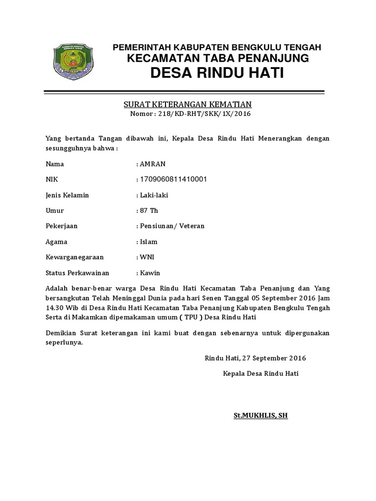 Untuk membuat surat pernyataan bisa baca contoh surat pernyataaan. Membuat surat pengantar dari rt /rw setempat; Demikian surat keterangan kematian ini kami buat sejujur jujurnya diberikan untuk dapat dipergunakan sebagaimana mestinya. Panduan lengkap cara mengurus akta kematian di capil san. Contoh surat permohonan surat keterangan ahli waris. Doc surat keterangan kematian docx arina wahyu academia edu. Home » contoh surat » contoh surat keterangan kematian dari rt. Surat keterangan kematian biasa digunakan untuk mempermudah atau melengkapi persyaratan tertentu. Surat keterangan kematian tidak kalah pentingnya dari akte kelahiran, selain sebagai untuk pengurusan administrasi, tetap juga sebagai alat pemerintahan untuk mendata jumlah kematian. Surat ini dianggap sah menurut hukum, sehingga mereka yang tercantum namanya dalam surat keterangan tersebut, secara hukum dianggap berhak atas warisan. Surat keterangan kematian merupakan suatu keterangan tentang kematian yang dibuat oleh dokter. Siapkan fotokopi kk dan ktp semua ahli waris; Savesave contoh surat kematian for later.